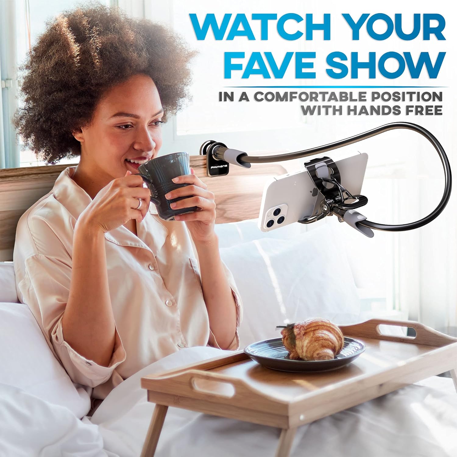 No more phone falling and hitting your face when you are watching a show from your phone before falling asleep. Attach our cell phone holder for bed to the bed’s frame or your bedside table and enjoy a hands-free watching experience. It can be used anywhere, in any position, and at any viewing angle