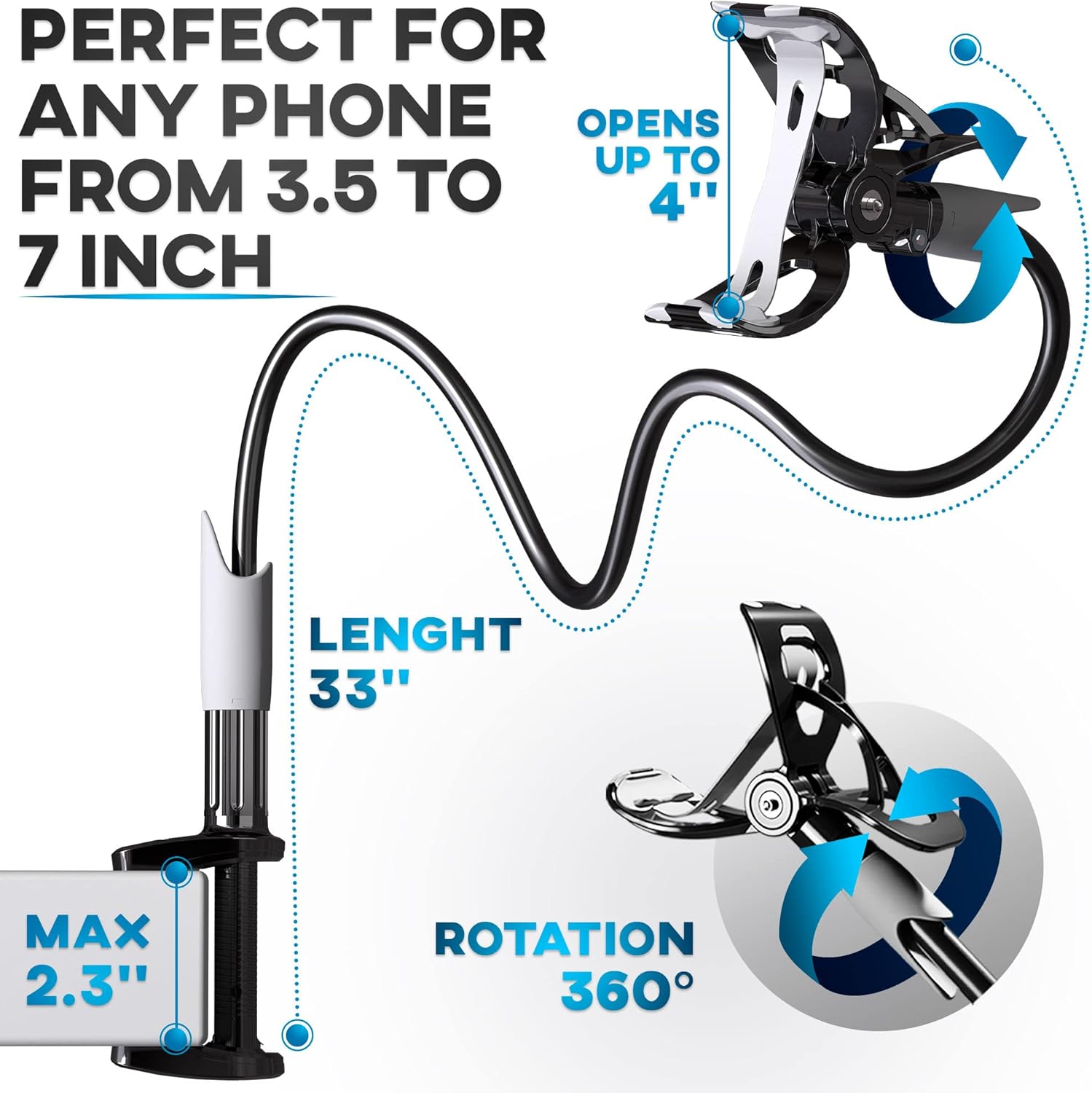The phone clipping system reliably fixes the phone of any size that falls within its opening range (that is 4 inches). The base of this phone holder can be opened up to 3 inches, which means that you can attach this phone mount for bed to any flat surface that is less of 3 inches in its widths